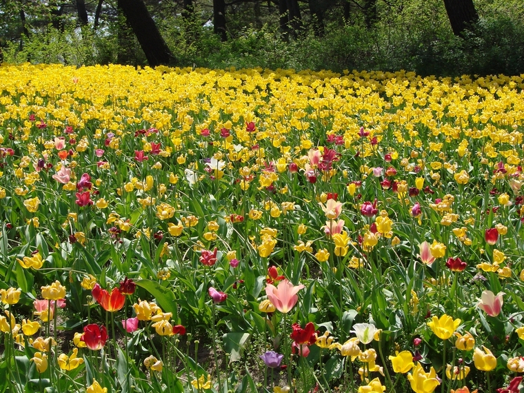 黄色のチューリップのジュータン、来年はこのチューリップ畑が見れないのは残念。