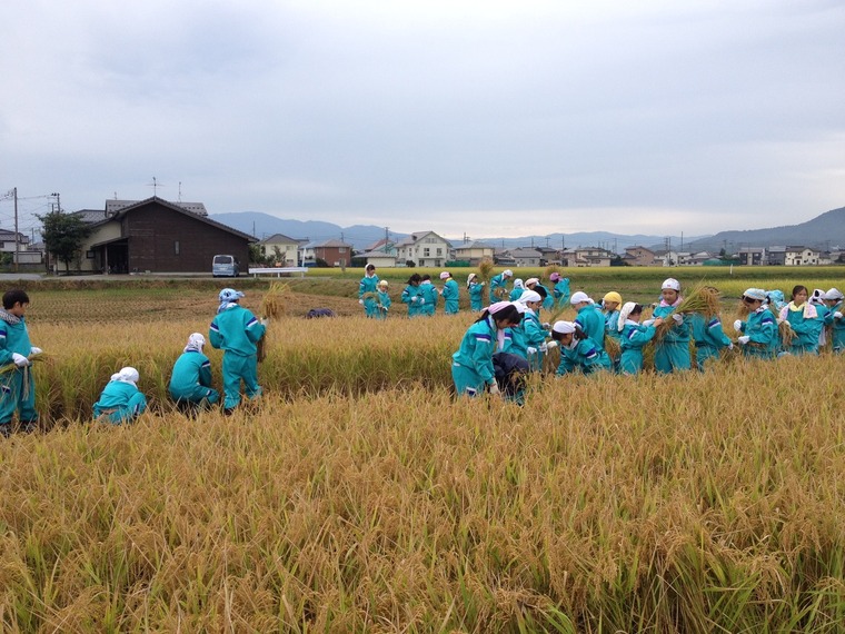近くの小学校の5年生と春に田植えしたもち米の稲刈りです
