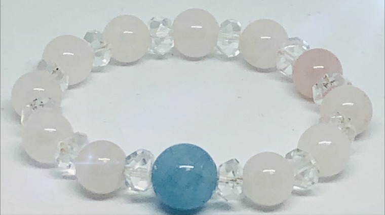 恋愛成就で有名なローズクォーツとコミュニケーションの向上させると言われるアクアマリンで親密な関係を築くことができる効果が期待できますね。