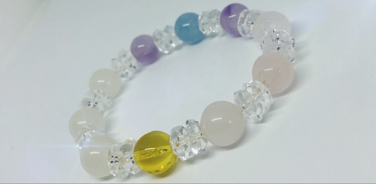 ローズクォーツや白翡翠の他にアメジストとシトリンとアクアマリンが組み込まれています。