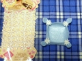 フエルトを正方形に切り取り 四隅をつまんで木綿糸でくくりきつく糸を引っ張り切る 結ぶ必要は有りません きつく引っ張る事でフエルトが一次的に絡み合って糸がほどけ難い そこにボンドをちょっと付け、切り取ったモチーフを貼り付けて留めてしまいます